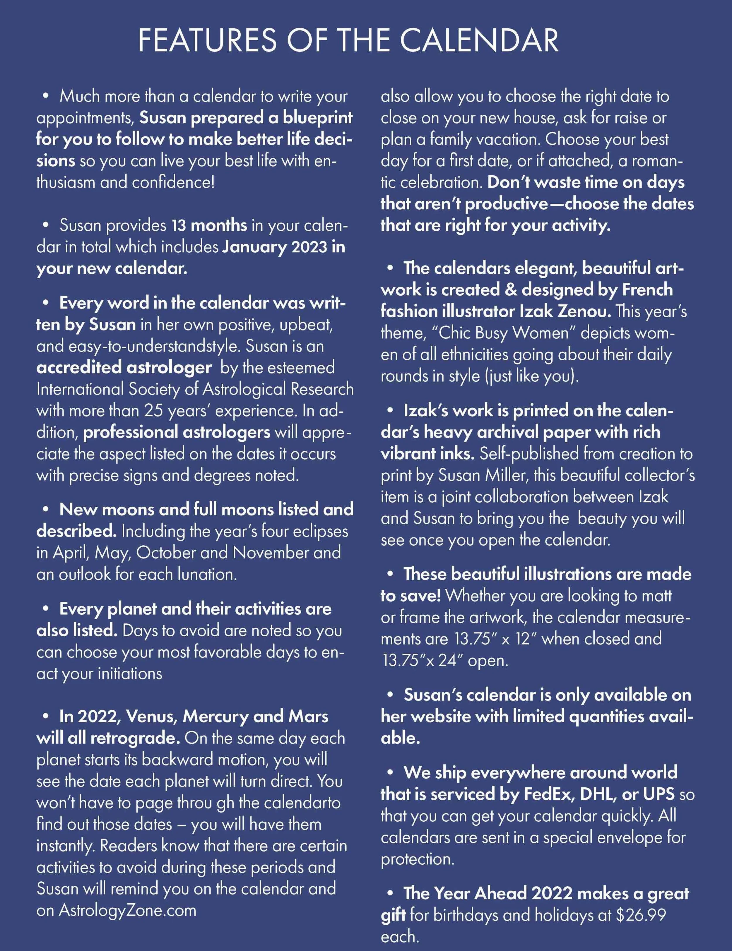 The 2022 Year Ahead Calendar is available on www.AstrologyZone.com. We look forward to working together with you in the future. —Cheers! Traffic